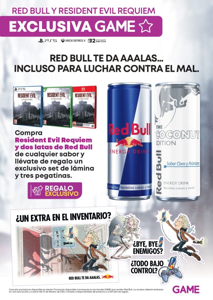 Vas a tener que pasar muchas horas delante de la pantalla, ¡y con Red Bull vas a poder aguantar todo lo necesario! Aprovecha para comprar Resident Evil Requiem junto a dos latas de Red Bull en GAME y llévate un set de lámina y pegatinas exclusivo de regalo, ¡el pack completo para empezar tu partida!*